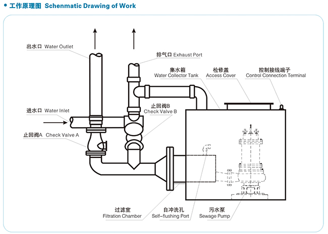 WQP型污水強(qiáng)力排放設(shè)備, 是我公司技術(shù)研發(fā)人員結(jié)合現(xiàn)場(chǎng)實(shí)際使用情況,以經(jīng)濟(jì)實(shí)用、環(huán)保高效為核心自主開(kāi)發(fā)的新一代產(chǎn)品。它的特點(diǎn)是利用設(shè)備過(guò)濾功能將污水中的雜質(zhì)和固體顆粒巧妙的擋在雜質(zhì)沉積腔里, 當(dāng)集水箱內(nèi)水位達(dá)到設(shè)定啟泵水位時(shí), 污水泵啟動(dòng)將箱內(nèi)集水與沉積腔內(nèi)的雜質(zhì)一起排至室夕用F水檢査井里, 當(dāng)集水箱內(nèi)水位達(dá)到停泵水位時(shí), 污水泵停止完成了一次污水排放, 每排放一次, 就對(duì)沉積腔內(nèi)的雜質(zhì)清理一次, 既避免了雜物的沉積節(jié)省了人工定時(shí)清理;又使雜質(zhì)不通過(guò)污水泵,避免水泵卡死造成的損壞。因此贏得了廣大新老用戶(hù)的青睞。
